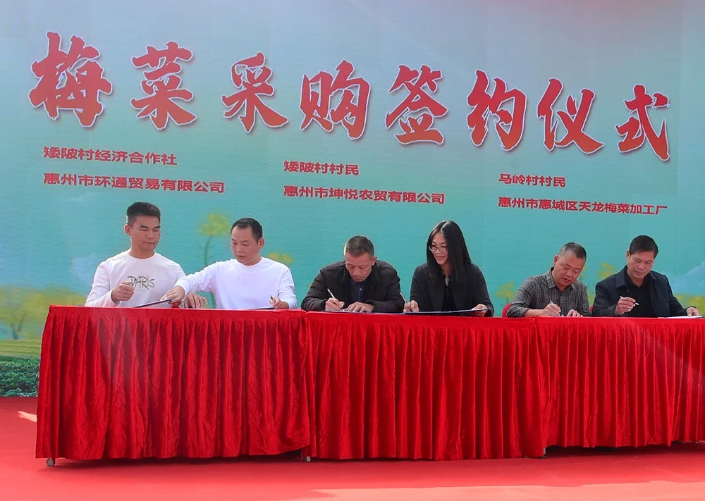 產(chǎn)業(yè)的發(fā)展離不開產(chǎn)銷結(jié)合。活動中,矮陂村經(jīng)濟合作社與惠州市環(huán)通貿(mào)易有限公司、矮陂村村民代表與惠州市坤悅農(nóng)貿(mào)有限公司、馬嶺村村民代表與惠州市惠城區(qū)天龍梅菜加工場分別簽訂梅菜采購協(xié)議,大力推動種植戶與梅菜企業(yè)、農(nóng)民合作社與種植企業(yè)合作,進(jìn)一步保障梅菜品質(zhì),規(guī)范生產(chǎn)標(biāo)準(zhǔn),拓寬梅菜銷售渠道。