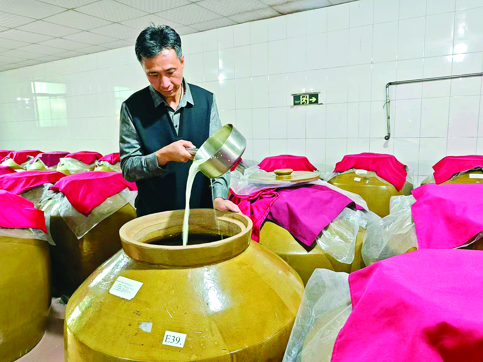 糯米酒的釀造需要經(jīng)過浸泡、蒸飯、下餅(酒曲)、糖化、發(fā)酵(陳釀)、壓榨、炙烤、澄清、勾兌、檢測(cè)、滅菌、裝瓶等12道工序。每一環(huán)節(jié)都嚴(yán)格把控,確保酒的品質(zhì)和風(fēng)味。走進(jìn)炙烤車間,20多平方米的屋子里,50個(gè)酒壇整齊排列,上面撒滿金黃的谷殼,每一個(gè)酒壇都承載著手工藝傳承的溫度。
