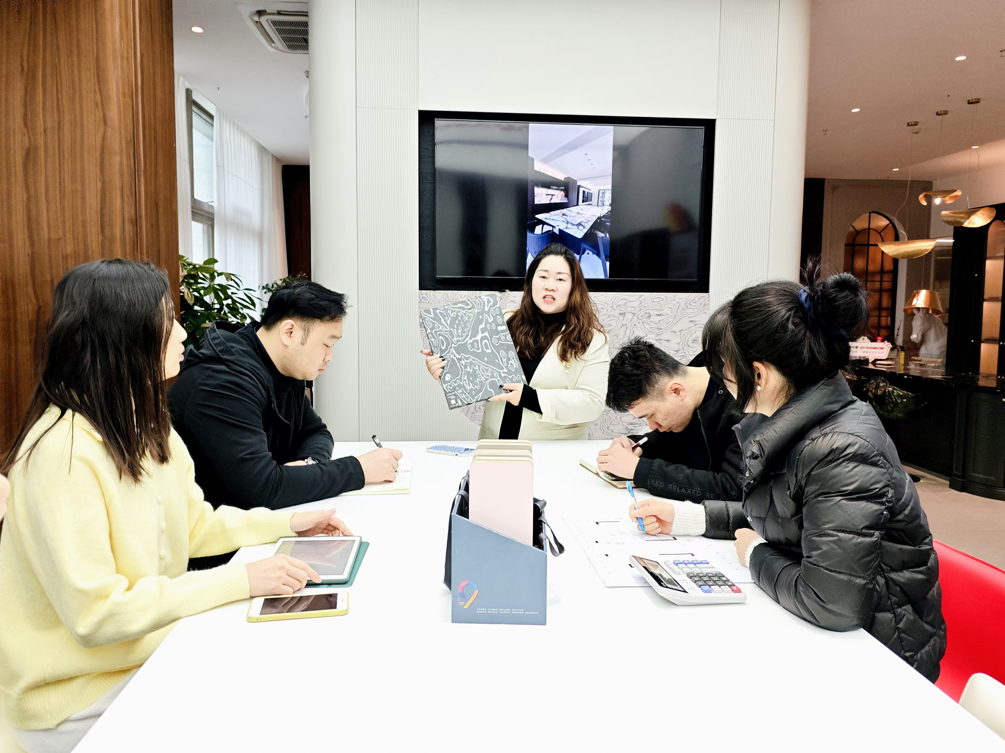 潘梅(中)與設(shè)計(jì)師們開會(huì)討論家居定制方案。