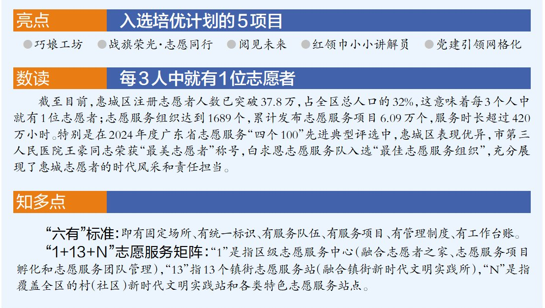 惠城區(qū)將按照“六有”標準,全面推進“區(qū)—鎮(zhèn)街—村(社區(qū))”三級志愿服務陣地建設。重點打造“1+13+N”志愿服務矩陣,積極推動公共場所建設志愿服務站點,讓志愿服務更加貼近群眾、服務群眾。統(tǒng)籌用好財政資金和社會資源,設立“惠城區(qū)志愿服務基金”,支持民生志愿服務項目發(fā)展。