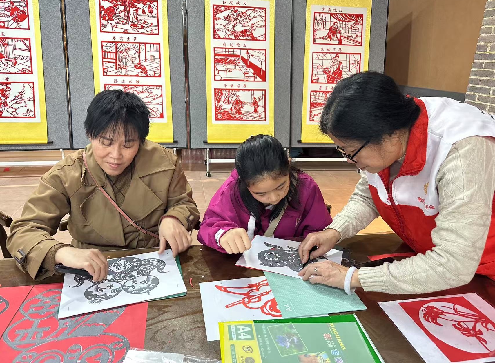 志愿者在教親子家庭學(xué)習(xí)剪紙。通訊員郭麗媚供圖