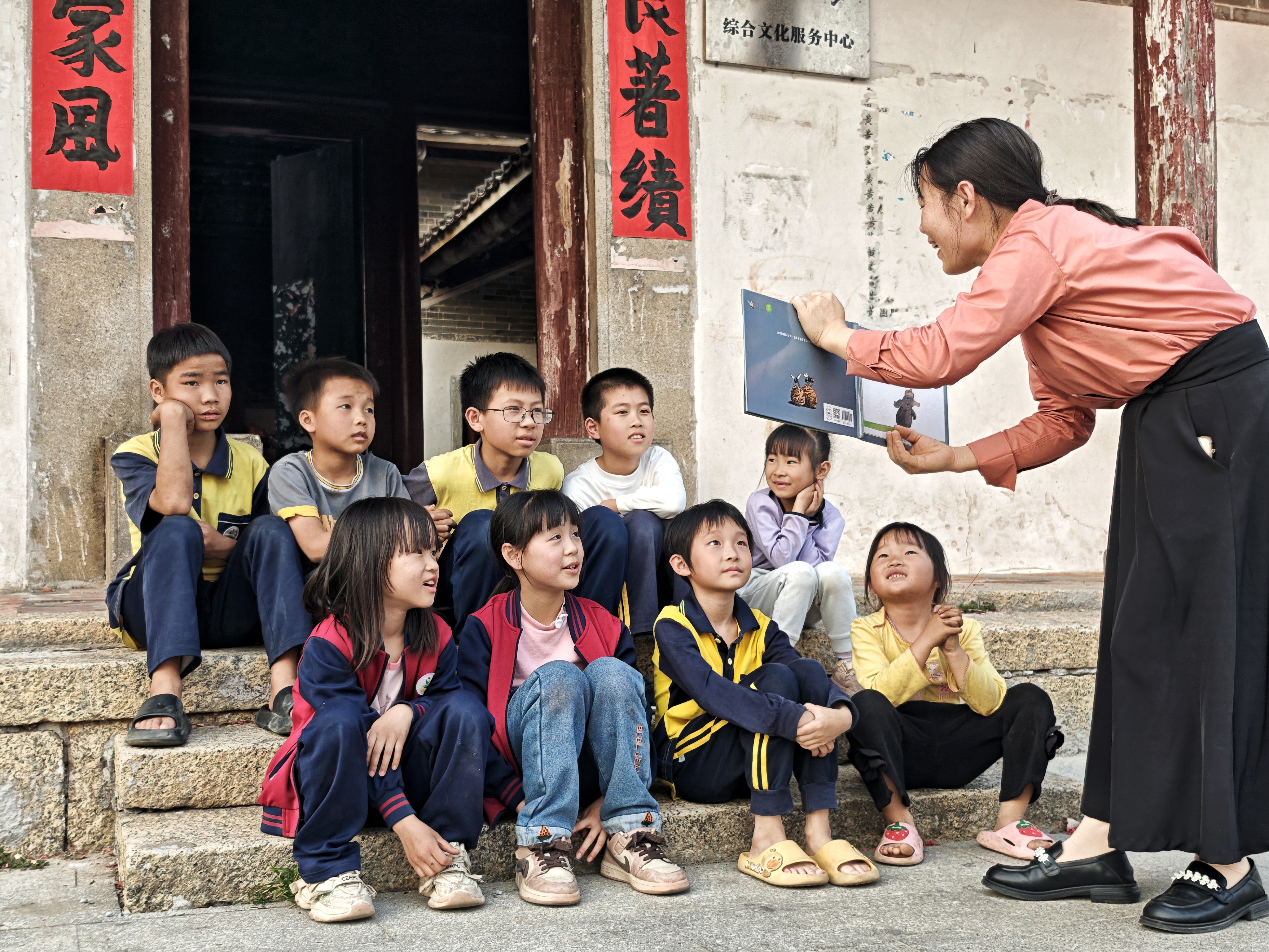 蘆洲鎮(zhèn)閱讀推廣志愿者在祠堂門(mén)前給村里的小朋友講故事。