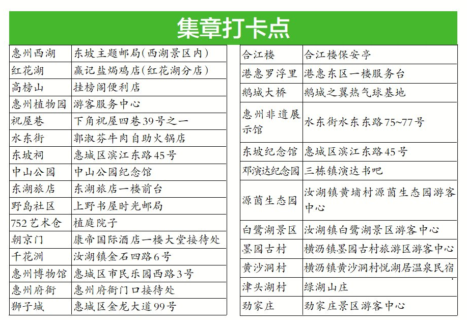 這28個(gè)集章打卡點(diǎn)不僅包括惠州西湖、紅花湖、高榜山、惠州植物園等知名景區(qū),還有水東街、祝屋巷等國(guó)家級(jí)旅游休閑街區(qū)、國(guó)家級(jí)夜間文化和旅游消費(fèi)集聚區(qū),野島社區(qū)、752藝術(shù)倉(cāng)等新興青年網(wǎng)紅打卡點(diǎn)也在列;葜莘沁z展示館、惠州博物館、東坡祠、中山公園、東湖旅店、朝京門、惠州府衙、合江樓等歷史人文景點(diǎn),墨園村、津頭湖村、黃沙洞村等寶藏鄉(xiāng)村也非常值得打卡。
