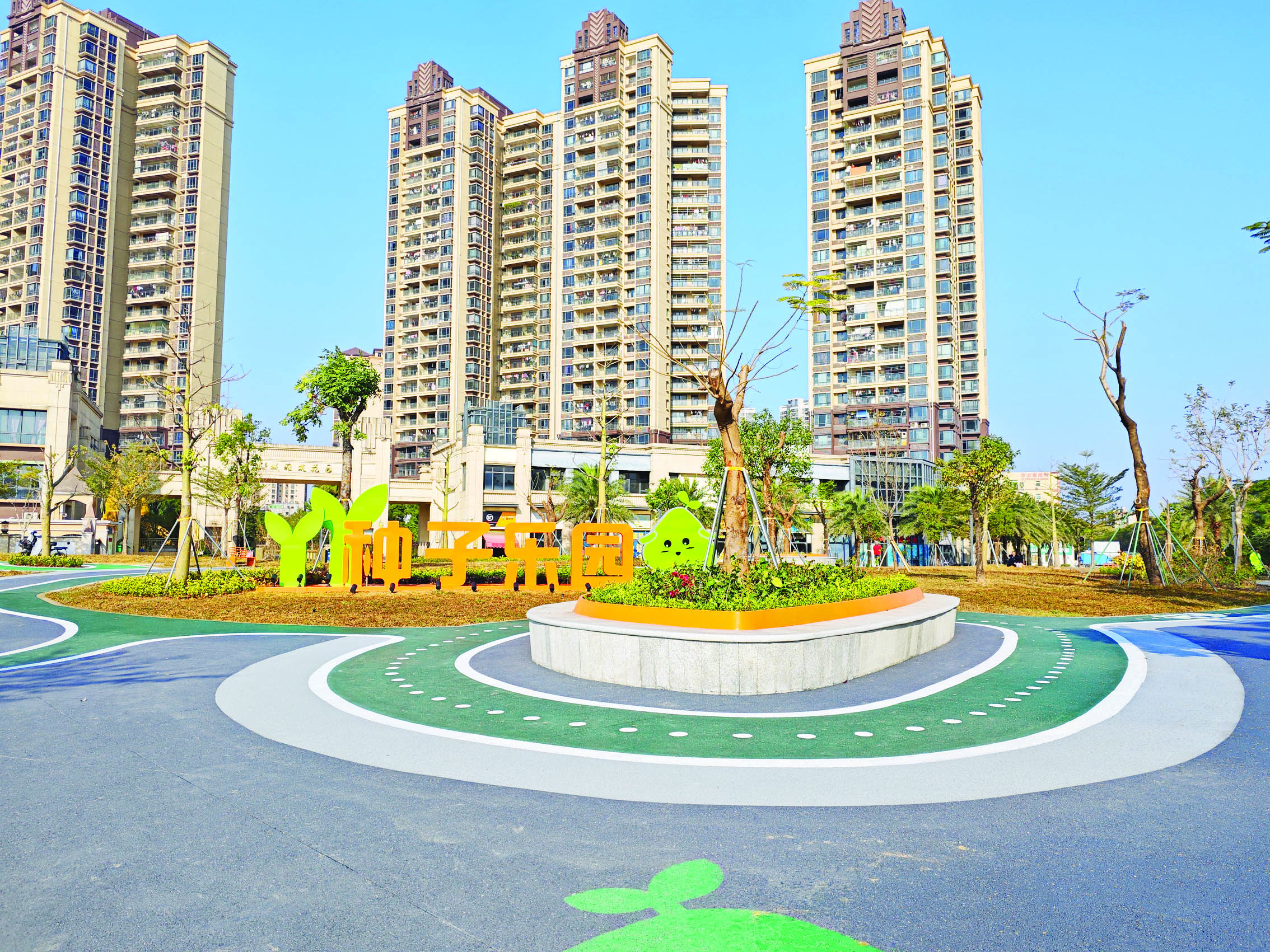 “種子樂園”鋪設(shè)綠色為主色調(diào)的橢圓形地板(形似種子),安裝庭院燈、射燈等照明設(shè)施,對(duì)4456平方米綠化面積全部安裝噴淋系統(tǒng),布置特色座凳、廊架和兒童砂池、種植科普等游樂及教學(xué)設(shè)施,讓公園既體現(xiàn)現(xiàn)代化,又與自然環(huán)境相融合!胺N子樂園”已成為附近居民最喜歡的打卡點(diǎn)之一,日均接待量達(dá)200余人次。