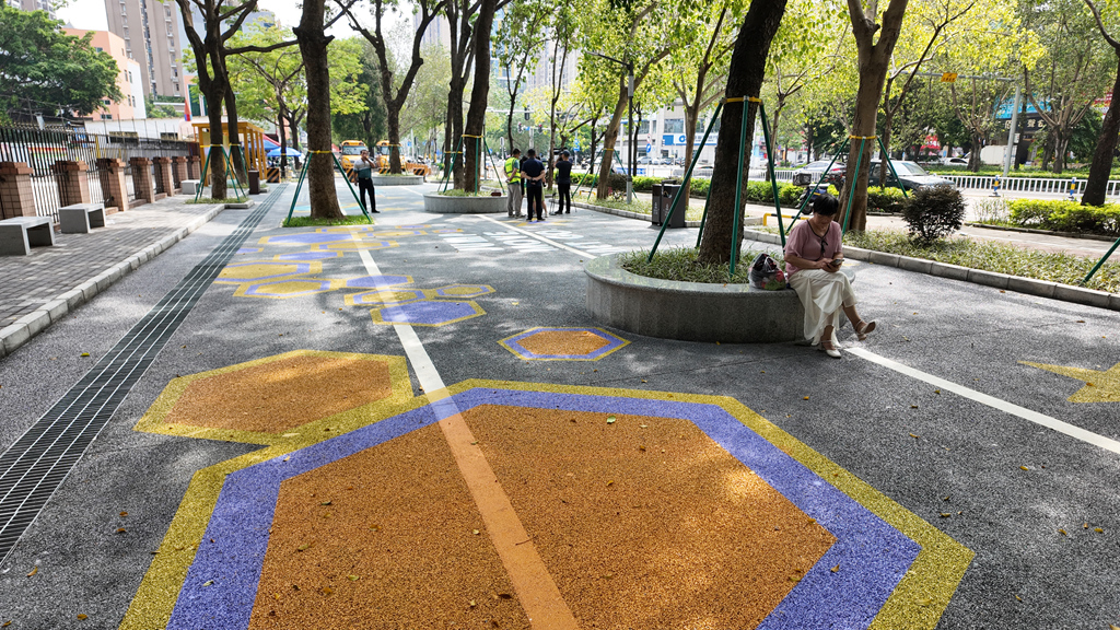 完善周邊設(shè)施:新增約200米藍(lán)色透水混凝土非機(jī)動車道,同步改造學(xué)校周邊人行道,不僅提升通行便利性,實(shí)現(xiàn)人車分流,更以一抹清新色調(diào)點(diǎn)亮整片街區(qū),實(shí)現(xiàn)功能與美學(xué)的統(tǒng)一。