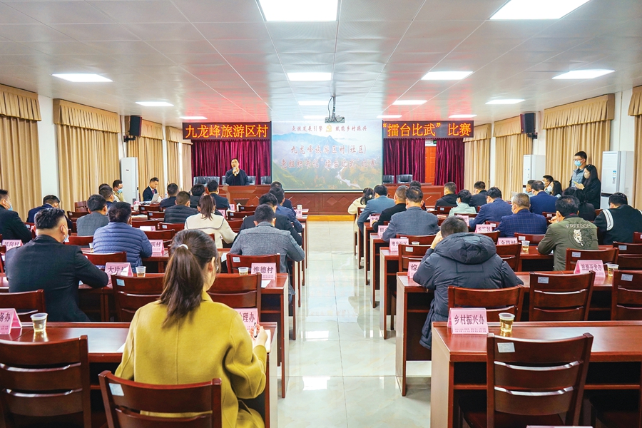 “我們村將依托鄉(xiāng)村振興戰(zhàn)略,積極壯大集體經(jīng)濟,大力發(fā)展艾草種植項目!逼浇妩h支部書記、村委會主任趙玩超在演講時介紹道。當日下午,九龍峰旅游區(qū)9個村級黨組織書記走上擂臺進行PK,通過圖文展示、現(xiàn)場匯報等方式,展示各村在基層黨建、鄉(xiāng)風(fēng)文明、人居環(huán)境整治、基層治理等方面的亮點做法、思路打算。