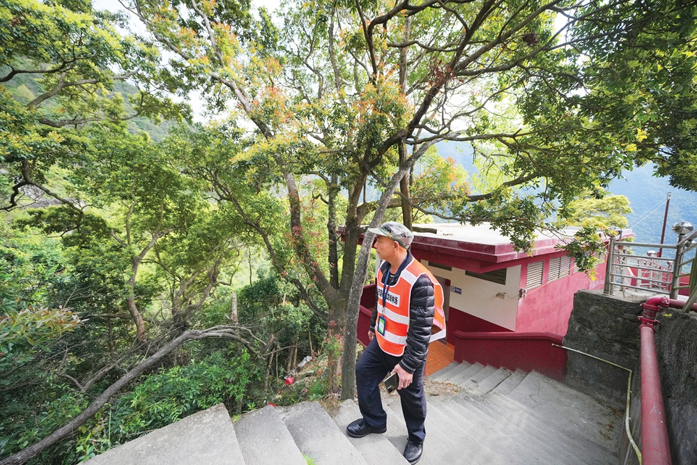 今年41歲的護林員嚴(yán)達權(quán)沒有“偷得浮生半日閑”的心情,走在寺廟外的小徑上,他不忘時刻保持警惕,觀察四周煙火情況。剛完成上午的巡護,看到不少香客進大南山龍巖寺,他下午還需再來巡護。