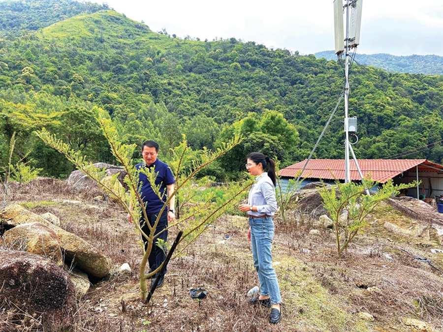 徐妙珍和同事在查看油柑種植情況。 惠州日報記者藍(lán)斐菲 攝