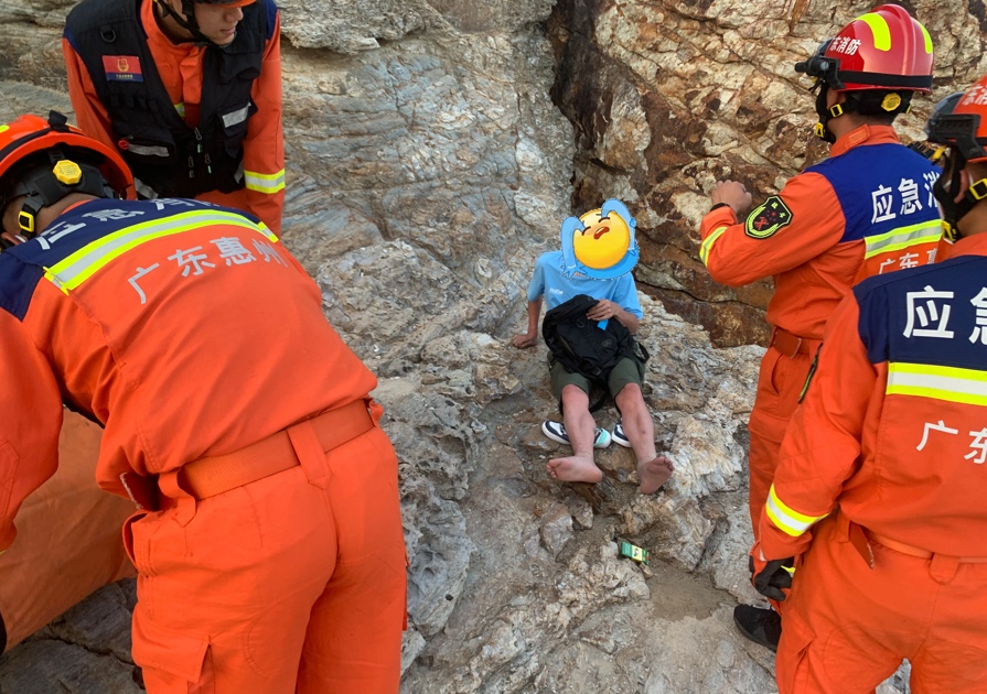 到達(dá)現(xiàn)場后,消防員發(fā)現(xiàn)一名男子坐在海邊礁石上,便立即前往檢查傷者情況,發(fā)現(xiàn)男子雙腿摔傷無法正常移動。了解情況后,消防員安撫好男子的情緒,立即展開救援。