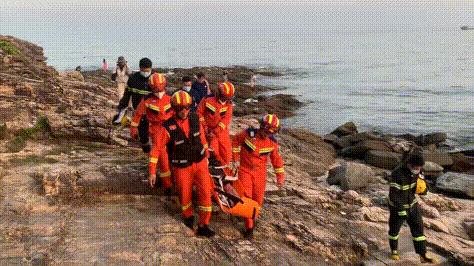 海邊礁石凹凸不平而且濕滑,稍有不慎就會對傷者造成二次傷害。因此,救援人員小心地將傷者固定在擔(dān)架上,輕輕抬起擔(dān)架,盡可能平穩(wěn)地將傷者從崎嶇不平的礁石上抬至平地等待醫(yī)護(hù)人員的到來。