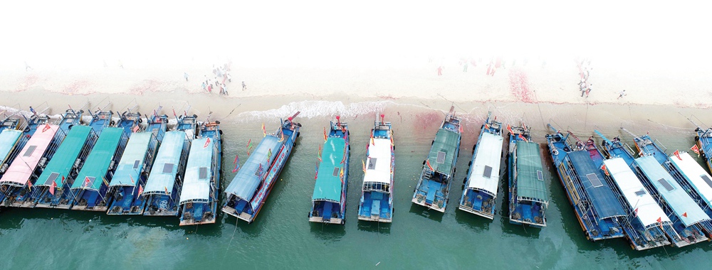 清晨,陽光刺破薄霧照在海面上。岸邊,漁船停靠碼頭整齊劃一,喜迎即將開始的海禮儀式。