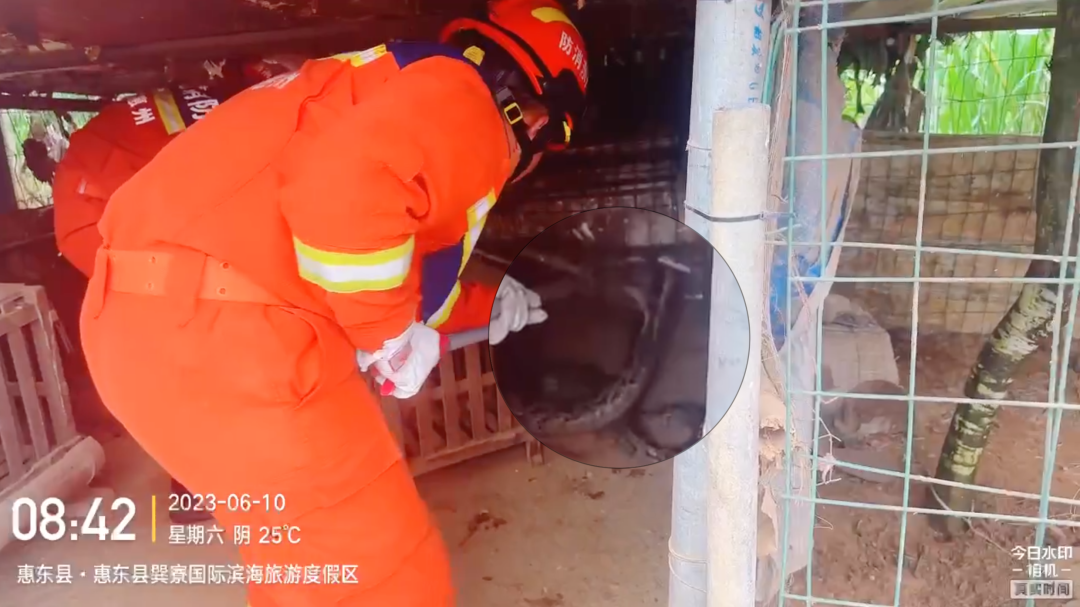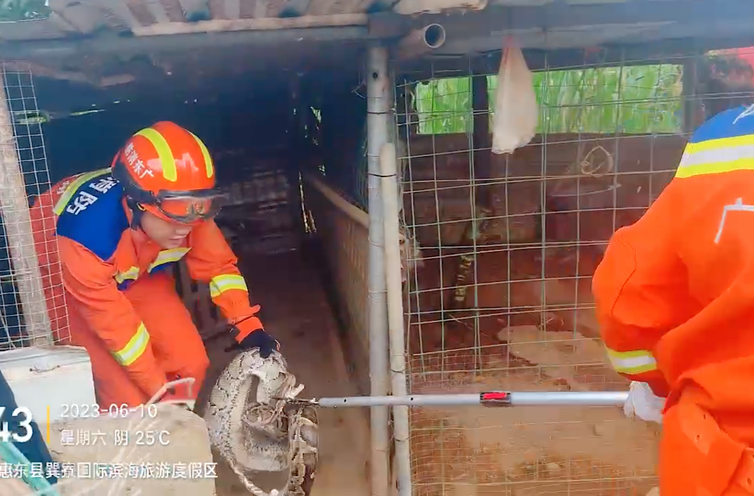 現(xiàn)場消防員使用捕蛇鉗工具,瞄準時機果斷出手,迅速抓住蛇的頭部,整個過程僅用了不到5分鐘的時間,將該條蟒蛇控制住并順利裝入事先準備好的網(wǎng)袋中。目前,大蟒蛇已經(jīng)交由惠東縣護林員放生。