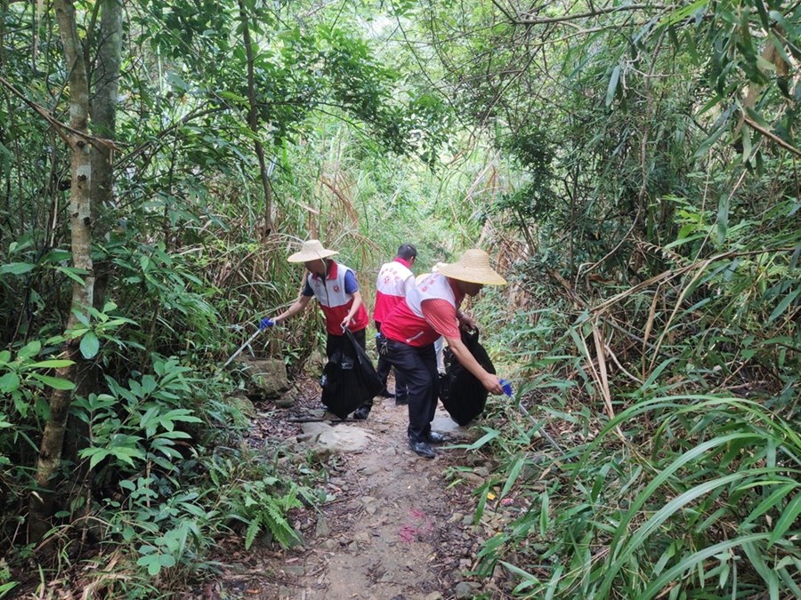 志愿者沿著登山徒步路線清理垃圾。 惠州日報(bào)記者藍(lán)斐菲 通訊員陳超 攝