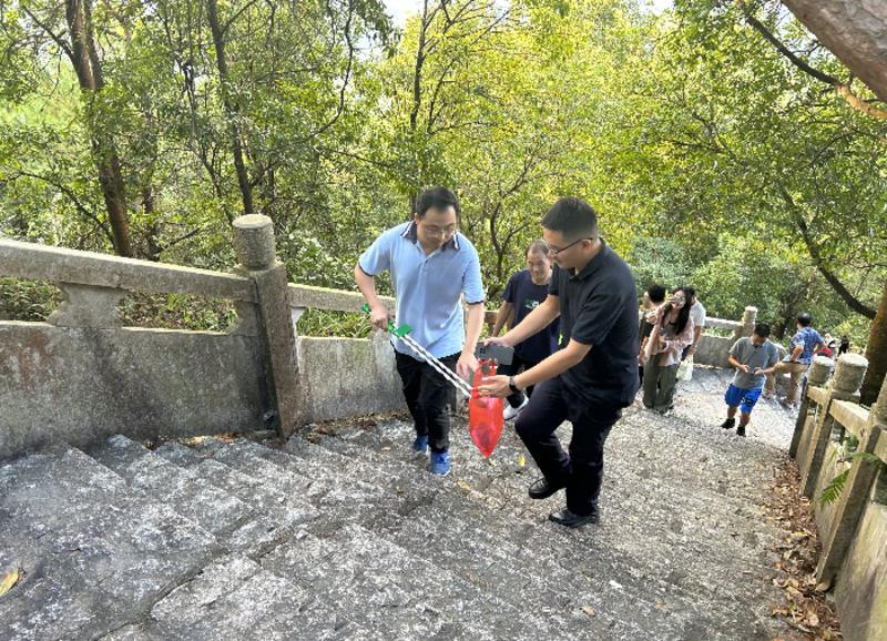 登山愛(ài)好者一邊登高望遠(yuǎn),一邊拾撿路邊垃圾。 惠州日?qǐng)?bào)記者藍(lán)斐菲 通訊員陳超 攝
