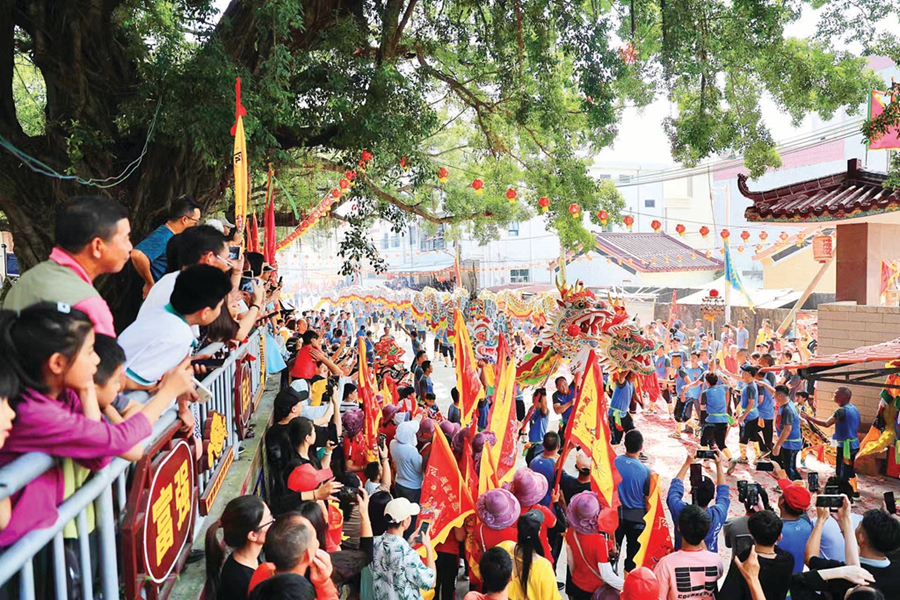 當(dāng)日巡游的規(guī)模宏大,來自8個(gè)村的巡游隊(duì)伍綿延數(shù)公里,在平海圩鎮(zhèn)、平海古城的大街小巷中穿梭,吸引了眾多游客參與和觀看。
