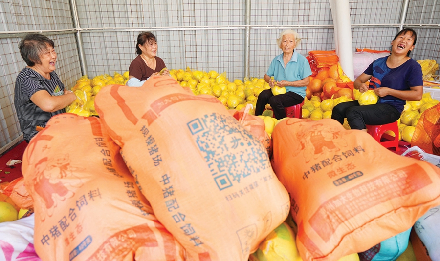 村民在打包分裝柚子。 惠州日?qǐng)?bào)記者楊建業(yè) 攝