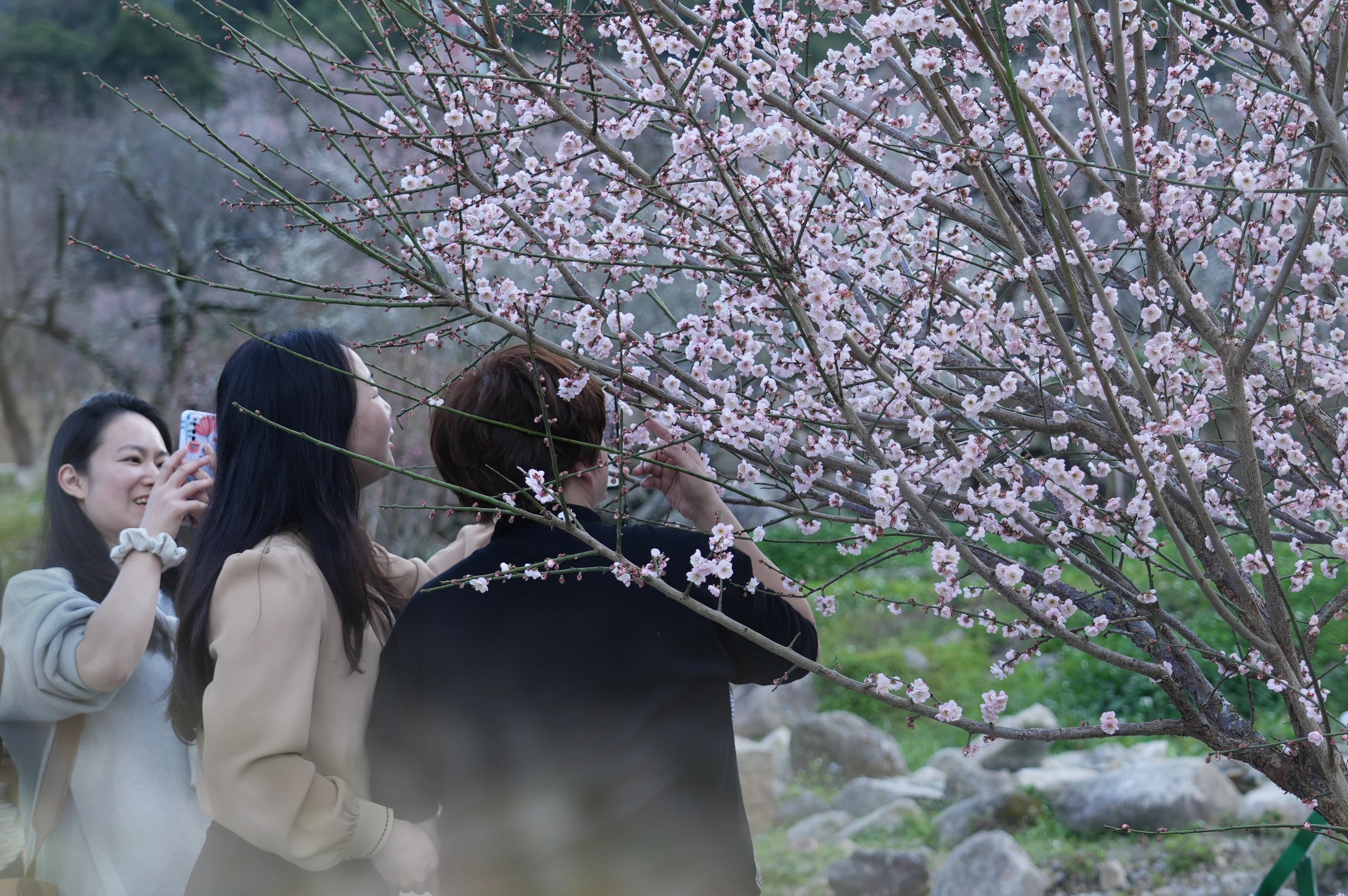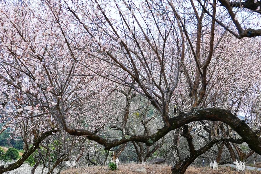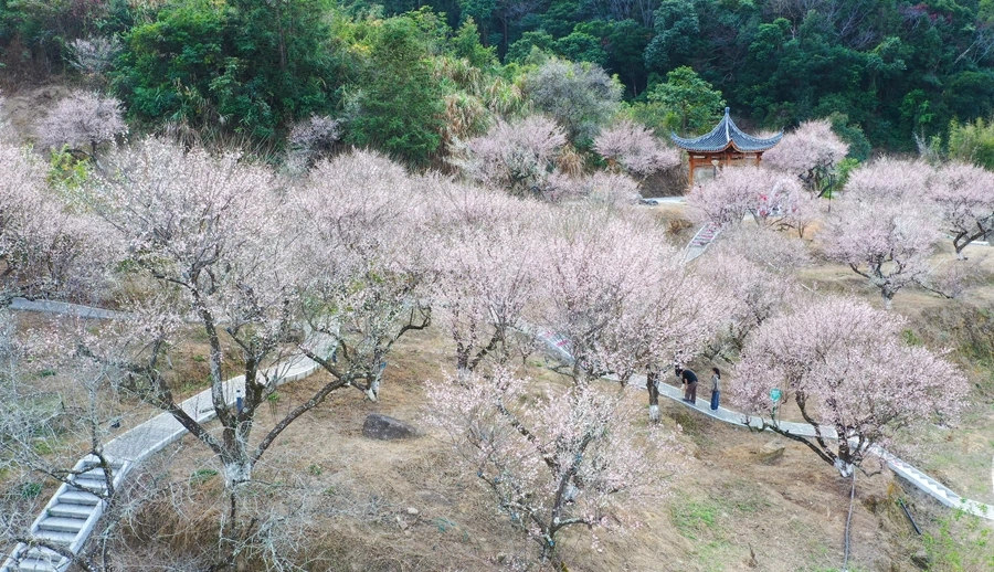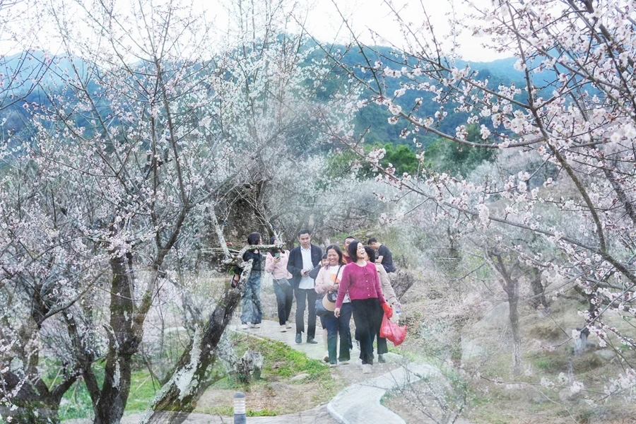 近日,惠州市惠東縣梁化國家森林公園梅園的千畝梅花競相怒放。記者沿著山丘看到,登山道上,游人如織,熙熙攘攘,甚是熱鬧。梅花層層疊疊,屈曲盤旋的枝干自由舒展,白的、粉的花蕾綴滿枝頭,一團團一簇簇,蜜蜂嚶嚶嗡嗡,翩飛于花瓣之上。不少游客慕名而來,賞梅聞香,拍照打卡。