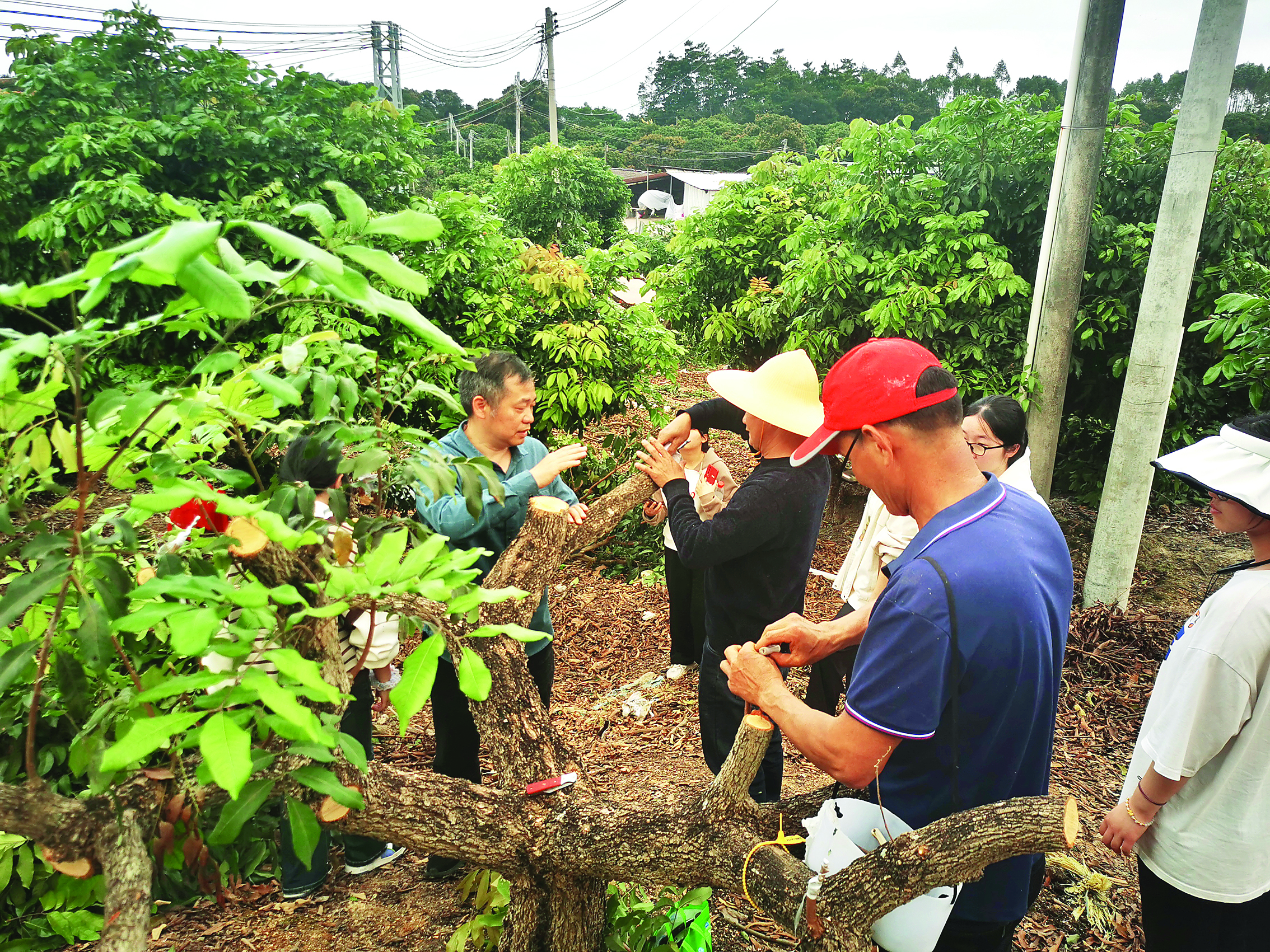 果園里,曾令達(dá)教授悉心地指導(dǎo)技術(shù)工人開展嫁接工作。技術(shù)工人正鉚足干勁,拿著電鋸修剪雜亂無(wú)章的枝丫。果園另一邊,苗木嫁接大師拿著小刀將切面削平整,切出嫁接切口,熟練地將“廣早”“良圓”枝丫插入切口中,并用膠布緊緊纏繞包裹。隨后,該區(qū)農(nóng)藝師與農(nóng)技人員進(jìn)行技術(shù)交流,并現(xiàn)場(chǎng)為學(xué)生示范嫁接技術(shù)和果樹病蟲害教學(xué),引得學(xué)生一致好評(píng)。