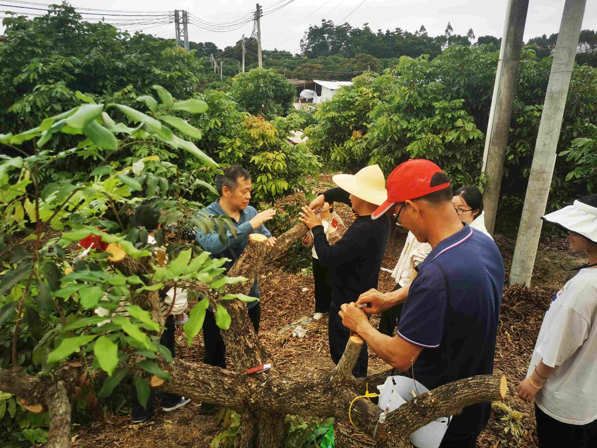 專家和農技人員到村里指導龍眼新產品改良嫁接。