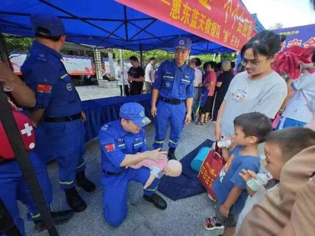 藍(lán)天救援協(xié)會隊員為群眾開展應(yīng)急救護培訓(xùn)。 惠州日報記者蔡偉健 特約通訊員葉衍達(dá) 攝