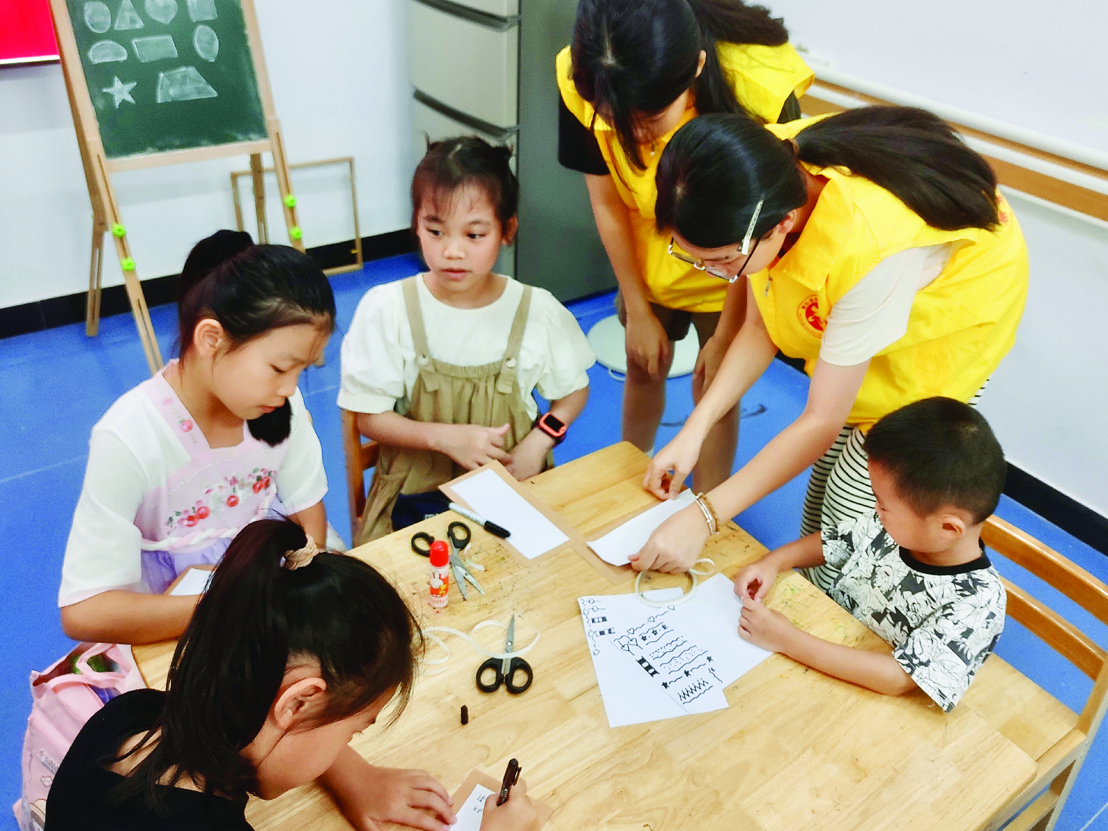 孩子們?cè)谥驹刚叩妮o導(dǎo)下制作書(shū)簽;葜萑?qǐng)?bào)記者洪鵲兒 通訊員肖燕輝 周秀容 攝