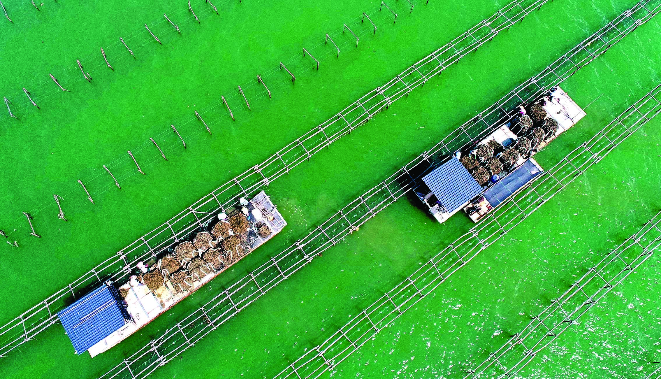 蠔農(nóng)出海前往養(yǎng)殖區(qū)采收生蠔。