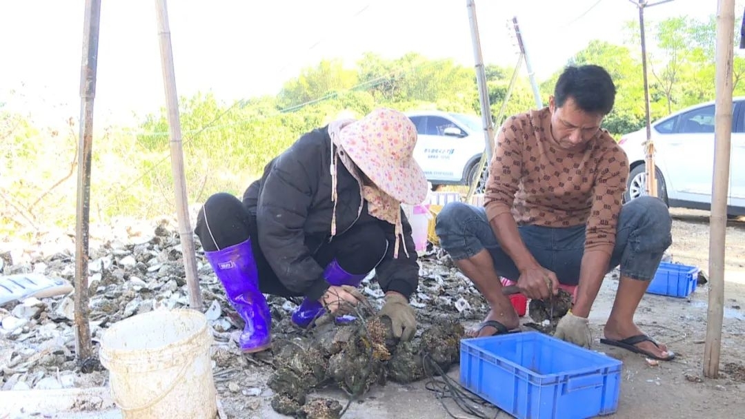 招賢村村民收生蠔。惠州日報記者蔡偉健 通訊員鄧心怡 李海澄 攝