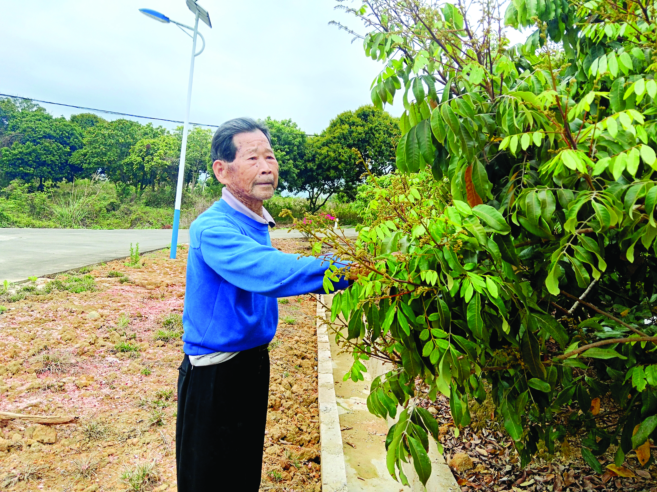 當(dāng)下正是植樹好時(shí)節(jié)。在惠東縣白盆珠鎮(zhèn)新和村一個種滿果樹的山坡上,一位瘦小的老人穿梭在果林里,只見他時(shí)而鉆入樹下清理枯葉,時(shí)而起身查看枝頭綻開的花朵……這位老人叫邱勝堯,是一名有著65年黨齡的老黨員。