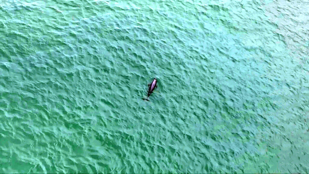 “通過航拍影像,我們可以清晰地看到它們的背脊上的疣粒區(qū)很寬,這是印太江豚的一個典型特征。”從來自中國水產(chǎn)科學(xué)研究院南海水產(chǎn)研究所科研人員拍攝的視頻可以看到,3頭印太江豚在湛藍(lán)的海水中肆意暢游,非;钴S。據(jù)該所科研人員介紹,當(dāng)天下午3點(diǎn)左右,他們正在海龜灣附近海域航拍監(jiān)測時(shí)發(fā)現(xiàn),平靜的海面上,突然出現(xiàn)1頭江豚,四處游動捕食,非;钴S,到了下午6點(diǎn)又有另外2頭江豚加入進(jìn)來。這3頭江豚捕食的地方就位于港口海龜灣附近海域,距離海灘僅約90米。
