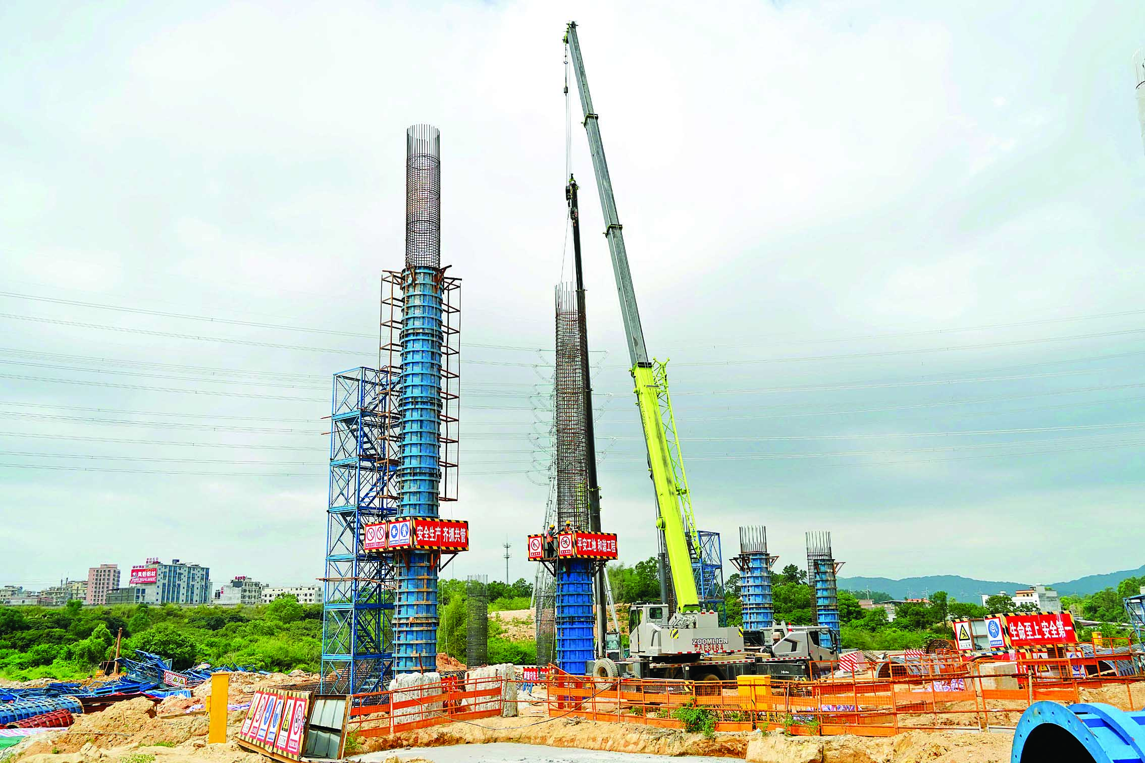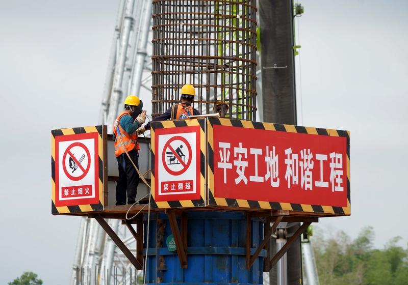 工人在進行橋梁立柱施工。