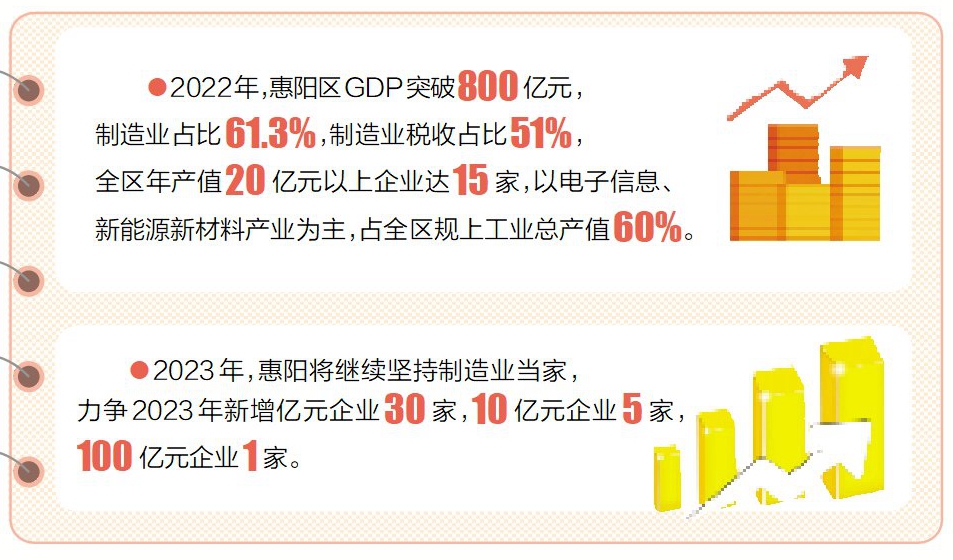 2023年,惠陽(yáng)將繼續(xù)堅(jiān)持把發(fā)展經(jīng)濟(jì)的著力點(diǎn)放在實(shí)體經(jīng)濟(jì)上,堅(jiān)持制造業(yè)當(dāng)家,聚力打造電子信息、新能源新材料兩大現(xiàn)代產(chǎn)業(yè)集群。力爭(zhēng)2023年新增億元企業(yè)30家,10億元企業(yè)5家,100億元企業(yè)1家。