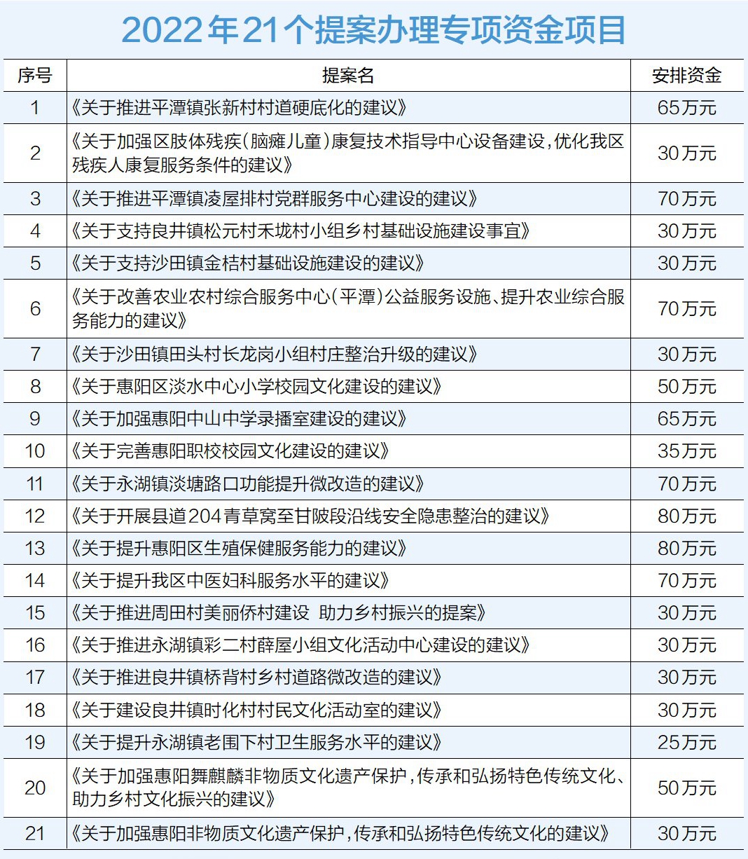 村級黨群服務(wù)中心建設(shè)、傳承和弘揚特色傳統(tǒng)文化、農(nóng)業(yè)農(nóng)村綜合服務(wù)中心公益服務(wù)設(shè)施改善、縣道沿線安全隱患整治、基層醫(yī)療衛(wèi)生服務(wù)水平提升……2020年以來,惠陽區(qū)政協(xié)積極總結(jié)提案工作經(jīng)驗,探索創(chuàng)新提案工作方法和形式,提請惠陽區(qū)委、區(qū)政府每年安排1000萬元作為政協(xié)提案辦理專項資金,切實發(fā)揮了提案在政協(xié)委員履職中的積極作用。2022年,惠陽區(qū)政協(xié)全力推動21個提案辦理專項資金項目有序開展、成效明顯,讓一件件涉及民生的好提案變成惠及民生的實作為。
