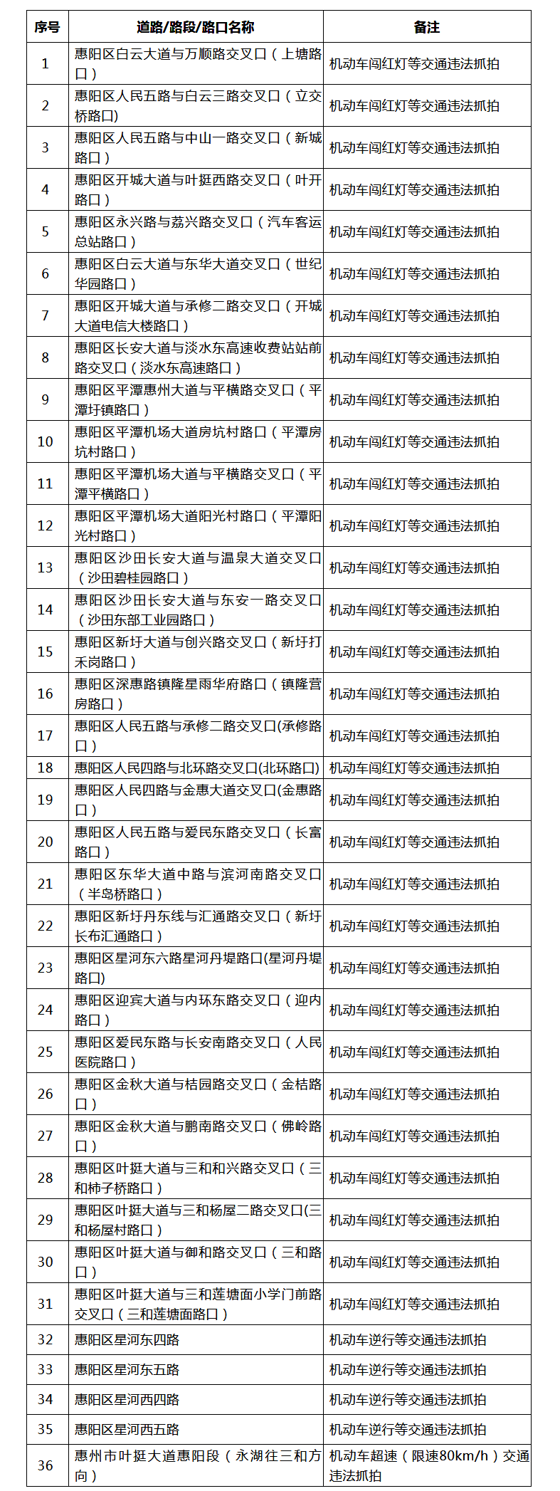 為加強惠陽區(qū)道路交通管理,規(guī)范道路交通秩序,維護道路交通安全,預(yù)防和減少道路交通事故,惠陽區(qū)交警部門準備啟用(重啟)轄區(qū)36個點位交通技術(shù)監(jiān)控設(shè)備,為保證道路交通管理執(zhí)法規(guī)范、透明、公正,按照《道路交通安全違法行為處理程序規(guī)定》第十六條第二款“固定式交通技術(shù)監(jiān)控設(shè)備設(shè)置地點應(yīng)當向社會公布”等有關(guān)規(guī)定,現(xiàn)將上述36處交通技術(shù)監(jiān)控設(shè)備所在位置予以公布,具體如下: