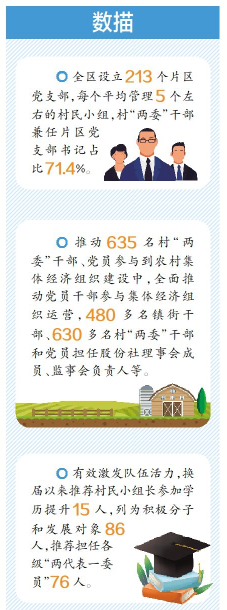 目前,全區(qū)設(shè)立213個(gè)片區(qū)黨支部,每個(gè)平均管理5個(gè)左右的村民小組,村“兩委”干部兼任片區(qū)黨支部書記占比71.4%,構(gòu)建“村黨組織—片區(qū)黨支部—自治單元—黨員戶”的組織鏈條。
