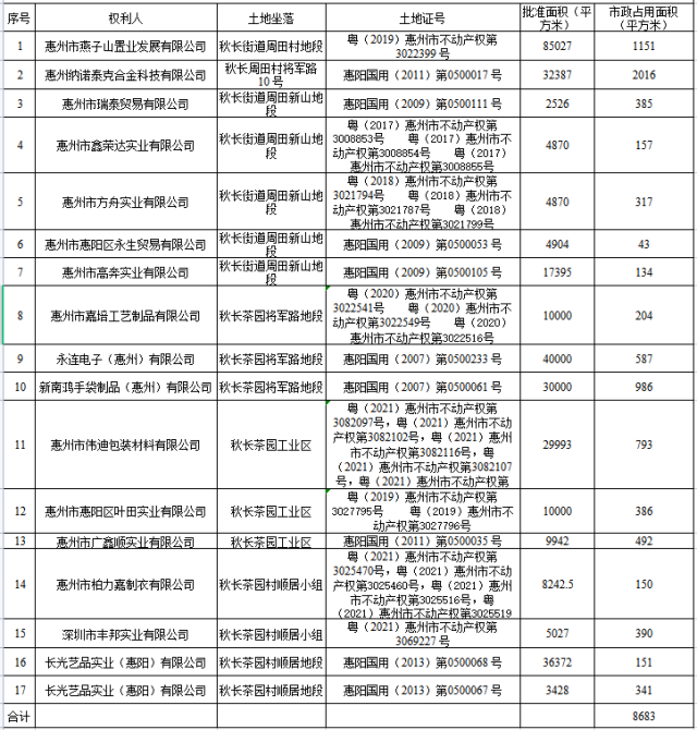 據隨公告一同發(fā)布的《惠陽區(qū)將軍東路 X225 線(二期)建設工程占用國有建設用地情況表》信息,需要占用土地涉及的17宗地塊均位于惠陽區(qū)秋長街道,歸屬于惠州市燕子山置業(yè)發(fā)展有限公司、惠州納諾泰克合金科技有限公司、惠州市瑞泰貿易有限公司、惠州市方舟實業(yè)有限公司、惠州市嘉培工藝制品有限公司和長光藝品實業(yè)(惠陽)有限公司等16家企業(yè),涉及總用地面積334983.5平方米。