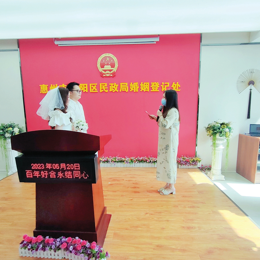 “我們呼吁新人積極倡導文明婚俗新風,理性看待婚姻登記‘好日子’。”工作人員介紹,5月20日當天,惠陽區(qū)民政局婚姻登記處增加了集體頒證、婚姻講堂等環(huán)節(jié),通過莊嚴而隆重的儀式,讓新婚夫婦感悟銘記婚姻家庭蘊含的責任擔當,帶頭倡樹健康文明、簡約適度的婚俗文化,傳承優(yōu)良家教家風,樹立正確的婚姻家庭觀。
