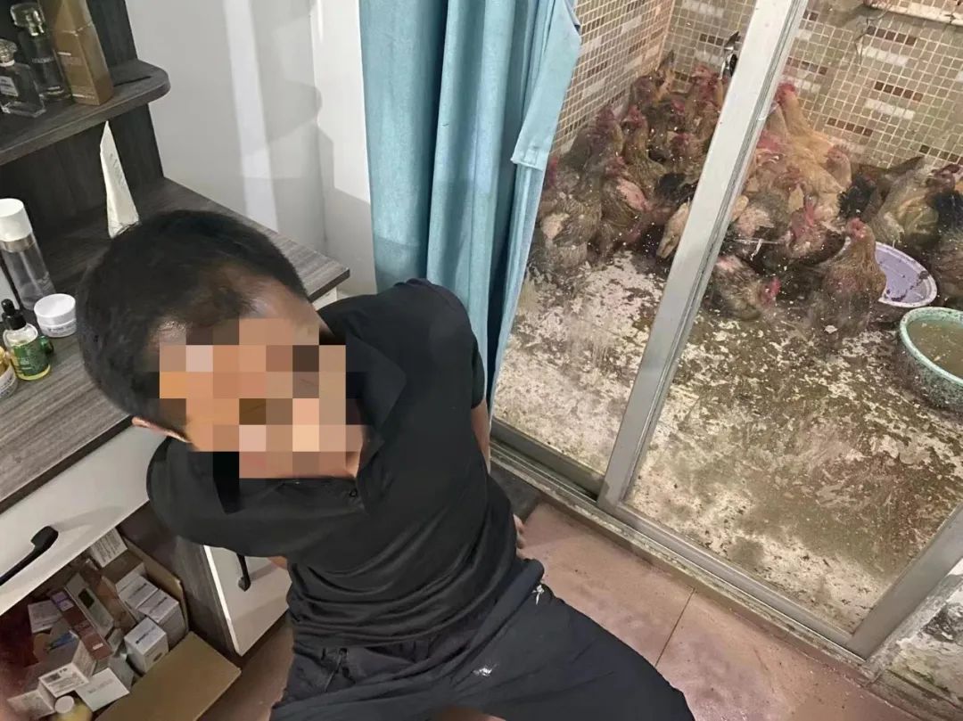 這名男子抱著兩蛇皮袋從雞舍中出來