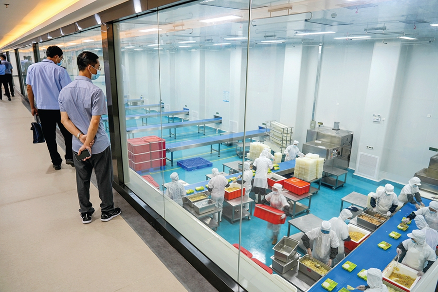 市場監(jiān)管執(zhí)法人員檢查配餐企業(yè)生產(chǎn)情況。