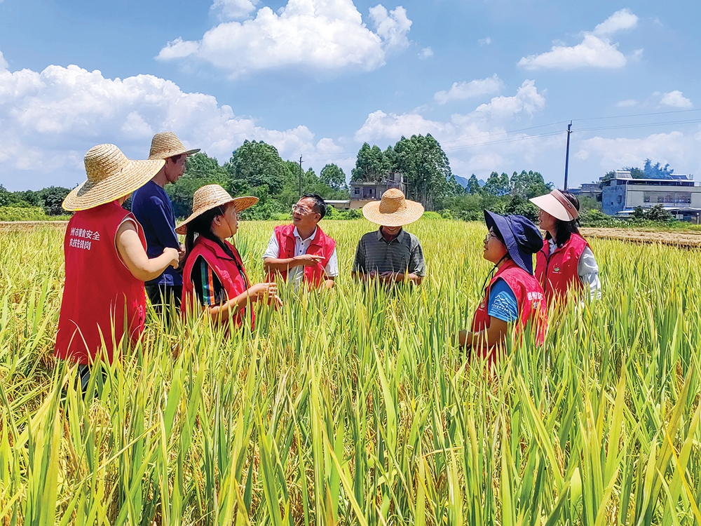 農技先鋒崗黨員在稻田里與村民交流水稻生長情況。