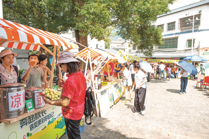 國(guó)慶當(dāng)天,“秋日集市”在惠陽(yáng)秋長(zhǎng)街道周田村古樹公園熱鬧開市。各種農(nóng)產(chǎn)品、特色小吃、非遺文創(chuàng)吸引了不少游客駐足和消費(fèi)。當(dāng)晚,“風(fēng)吹稻浪 秋之樂(lè)章”音樂(lè)會(huì)也在當(dāng)?shù)毓偕酱迩镆奥稜I(yíng)基地舉行,5支樂(lè)隊(duì)輪番上場(chǎng)彈唱經(jīng)典歌曲,游客沉浸式感受惠陽(yáng)獨(dú)特的鄉(xiāng)村魅力與活力。