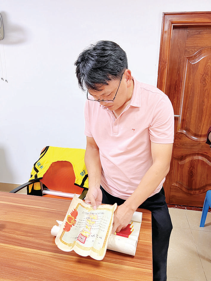吳建輝展示珍藏的爺爺?shù)母锩沂孔C明書(shū)。