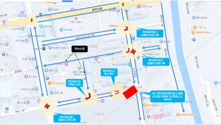 交通封閉管制方案為:施工期間,演達(dá)三路局部道路(演達(dá)三路與長安南路交叉口)實(shí)施全封閉施工,過往車輛建議繞行富源路、仲愷路以及愛民東路(見下圖)。