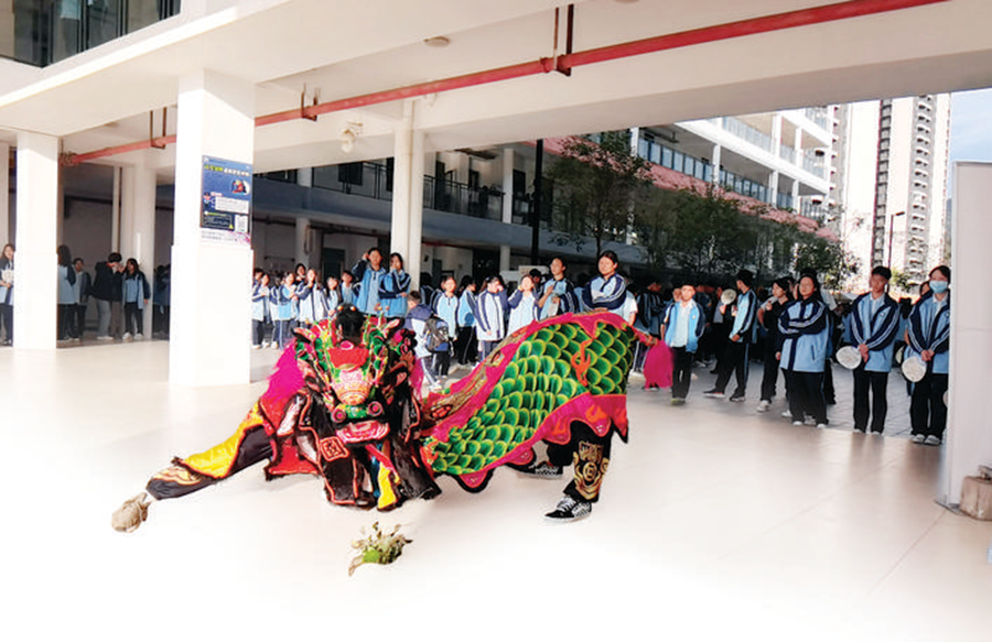 “以前只是聽說舞麒麟,沒想到今天能在校園親眼看到,真是非常震撼!”正在圍觀市級非遺——沙田舞麒麟習俗表演的高二(7)班學生劉銘惠與同學們被這一精彩的傳統(tǒng)技藝所折服,紛紛鼓掌喝彩。