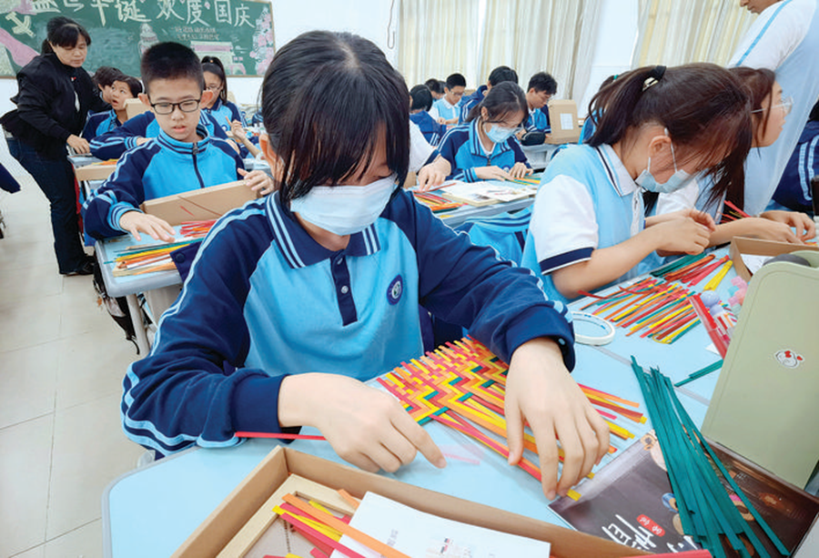 學生學習制作客家涼帽工藝品。 惠州日報記者許文昌 攝