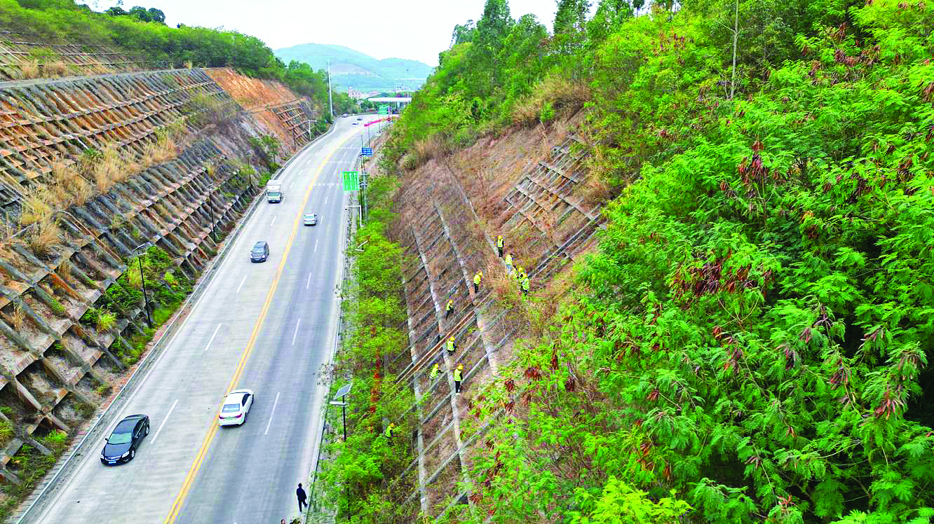 長深高速新圩出入口是新圩鎮(zhèn)要建設的美麗鄉(xiāng)鎮(zhèn)入口通道,工人在對擋土墻進行清理。