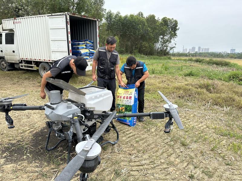 工作人員準(zhǔn)備將有機(jī)肥倒入大疆T60植保無人機(jī)肥料箱。 惠州日報記者李芳娟 通訊員張海波 攝