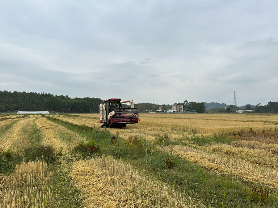 眼下正值春耕春播時節(jié),位于惠陽區(qū)平潭鎮(zhèn)新崗村的惠陽區(qū)最大連片糧食主產(chǎn)區(qū)(600畝)內(nèi),一邊是春耕繁忙播種希望的景象,一邊是收割機響起、收割冬小麥的豐收景象。這里50畝冬小麥是新崗村村民黃惠南為響應(yīng)國家“雙季稻+”輪作號召而首次嘗試種植的。