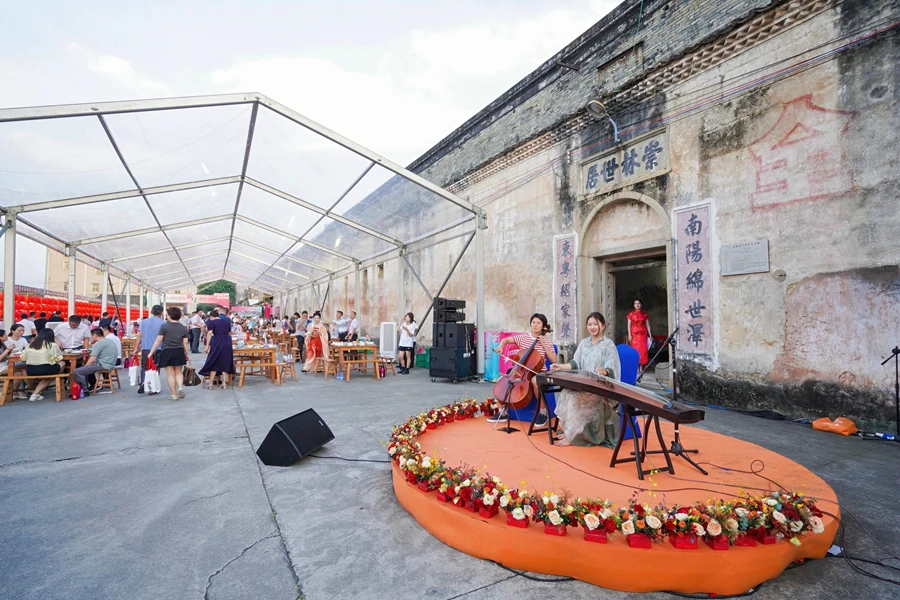 21日下午,記者在崇林世居看到,圍屋外圍張燈結(jié)彩,大紅燈籠高高掛起,門口已擺上了60桌圍桌,一張張古香古色的木桌,搭配著長(zhǎng)板凳,傳統(tǒng)而熱鬧。大圍屋荔枝感恩活動(dòng)于當(dāng)晚6點(diǎn)拉開序幕!凹已纭币岳笾ψ鳛橹黝}菜品,并在現(xiàn)場(chǎng)設(shè)置了荔枝酒、荔枝餅干、荔枝雪糕等荔枝文創(chuàng)產(chǎn)品展銷和品嘗區(qū),聯(lián)誼海內(nèi)外鄉(xiāng)親,同心共敘鄉(xiāng)情。