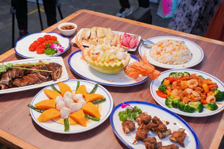 飯桌上七菜加炒飯,美味又創(chuàng)意?图胰苏写(dāng)屬“無(wú)雞不成宴”。貴妃荔枝雞是一道承載了鎮(zhèn)隆豐富文化內(nèi)涵的佳肴,精選荔枝果園走地雞,用荔枝湯慢煮浸熟,為雞肉增添了獨(dú)特的荔枝果香。荔枝海味奇緣清爽解膩,荔枝與蝦球、哈密瓜、百合、芹菜等食材跨界混搭,是傳統(tǒng)海鮮烹飪的創(chuàng)新與融合。荔枝蝦球是一道創(chuàng)意與美味兼具的精致菜品,鮮嫩大蝦搭配爽脆的馬蹄巧妙地制成蝦球,裹上脆花粒入鍋油炸,出鍋后是一顆顆形如荔枝的精致炸物,幾乎以假亂真。荔香客家祿鵝采用鎮(zhèn)隆獨(dú)有的祿鵝烹飪方式,將荔枝的清香滲入鵝肉當(dāng)中,使鵝肉充分吸收了荔枝的果香和清甜,同時(shí)自身的肉香也得以完美保留,并佐以秘制醬料,讓人口齒留香。荔枝咕嚕肉,將精選五花肉裹粉入鍋油炸成外層酥脆,佐以荔枝酸甜開胃,清爽不油膩,且散發(fā)著淡淡果香。還有醬香荔枝骨是一道結(jié)合了荔枝的果香與排骨肉香的新式菜品。