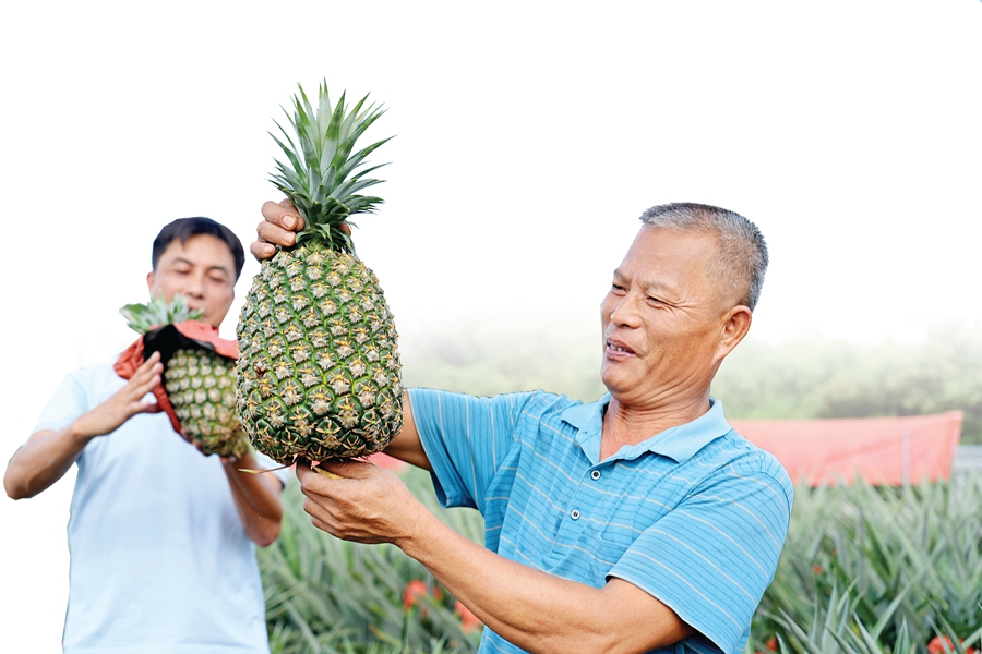 樓角村村道兩旁,一排排整齊的鳳梨長(zhǎng)勢(shì)喜人,沁人心脾的果香隨風(fēng)飄散,一顆顆個(gè)頭飽滿的鳳梨“端坐”在叢叢葉片中。斜坡上、菜園子旁,隨處可見(jiàn)村民們種植的鳳梨。偶遇在村道上玩耍的孩子,他們會(huì)熱情詢問(wèn):“你們要摘鳳梨嗎?”